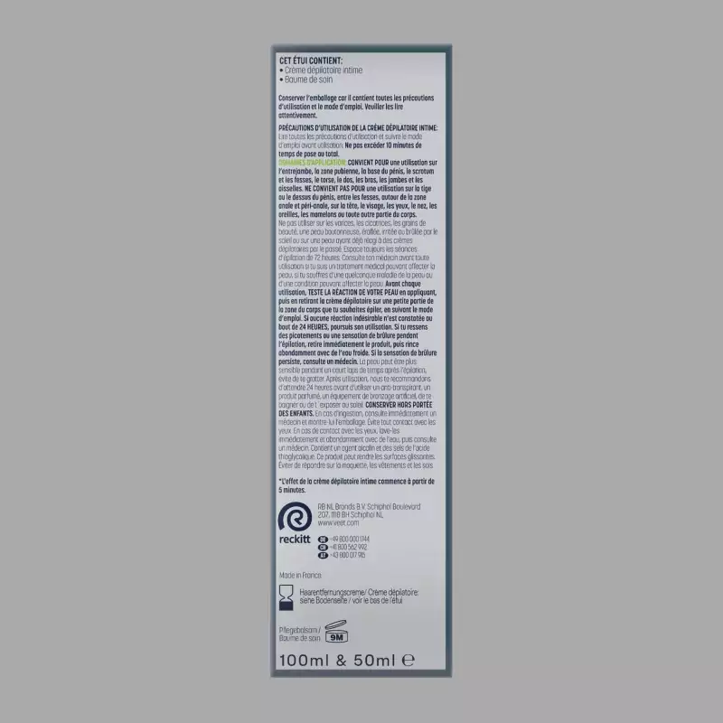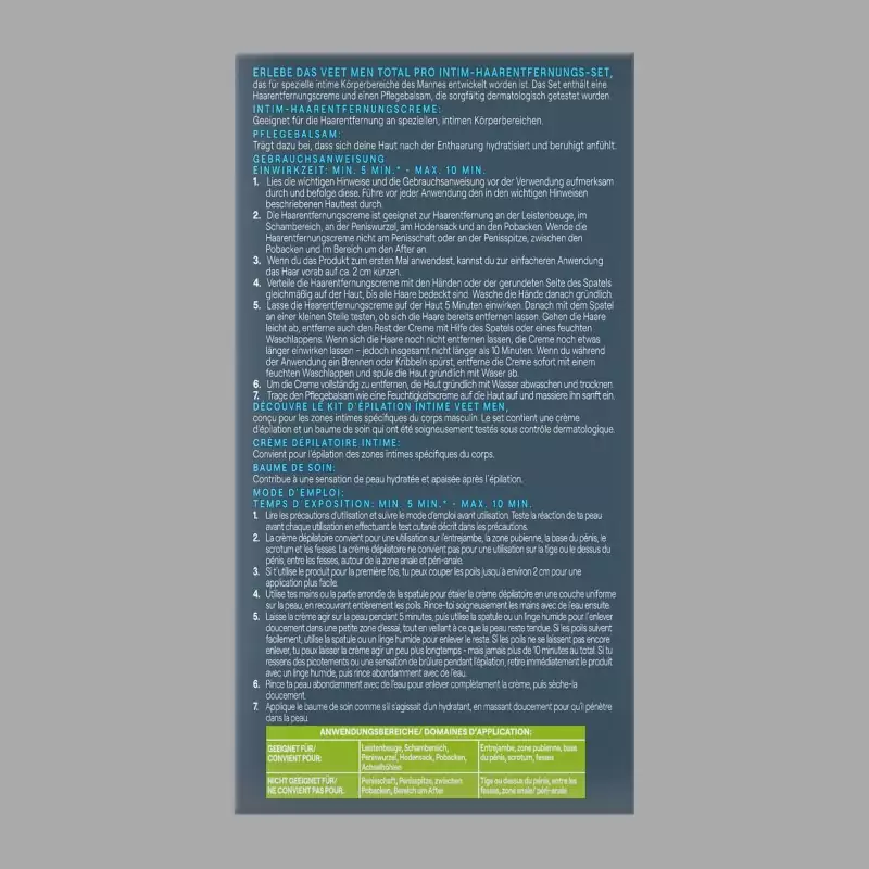 Veet Men Total Pro™ intimitāšu epilācijas komplekts ir īpaši izstrādāts lietošanai jutīgās intīmajās zonās. Depilācijas krēma intīmai zonai un kopjošā balzama ar alveju kombinācija nodrošina rūpīgu matiņu noņemšanu bez iegriezumu riska, kā tas var notikt skūšanās gadījumā. Rezultāts ir gluda, kopta āda tikai dažu minūšu laikā. Komplekts kā depilācijas krēms intīmajām zonām ir pielāgots jutīgas ādas īpašajām prasībām un ir ideāli piemērots kā depilācijas krēms vīriešiem.