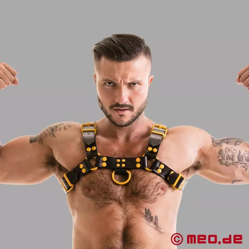 Ar šīm melni dzeltenajām MEO® ādas jostajām jūs varat izteikties un apliecināt savu atvērtību piss play - ideāli piemērotas atklātas erotikas cienītājiem. Fetish Gear Harness™ melnā un dzeltenā krāsā garantēti piesaistīs uzmanību ar saviem spilgtajiem akcentiem. Saskaņā ar "Hanky Code" augstas kvalitātes ādas siksnu dzeltenās detaļas simbolizē piss play - ideāli piemērotas ikvienam, kurš droši lauž tabu un atklāti parāda, kas viņu aizrauj.