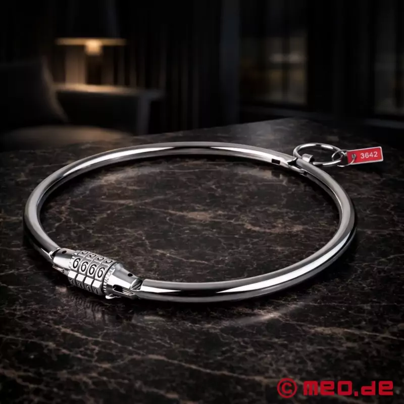 Nav atslēgas. Nav glābšanās. Mūsu BDSM vergu apkakle, kas izgatavota no nerūsējošā tērauda, apvieno stilīgu estētiku un nežēlīgu funkcionalitāti. Integrētā četru ciparu kombināciju slēdzene piedāvā 10 000 iespējamās kombinācijas, bet tikai viena no tām ved uz brīvību. Neatkarīgi no tā, vai tā ir pilnīgas pakļaušanās izpausme, aizraujoša pašbondāža vai intensīva pacietības un disciplīnas spēle - šī elegantā vergu apkakle simbolizē absolūtu kontroli, līdz tiek atklāts pareizais kods. Līdz tam laikam uz jums attiecas šādi noteikumi: Absolūta nodošanās, absolūti nekāda izkļūšana.