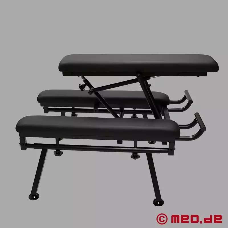 Fully adjustable, the MEO Fuck Bench puts the bottom exactly where you want them - at the perfect height for the top to drive, grind, pound, and control the pace. The central saddle raises or lowers, sits parallel to the lower benches, or angles up or down to open access right where it counts. Two adjustable steel rods underneath give precise height and angle control - lock the front and back wing nuts into the preset indents, tighten them down, and the bench stays put.