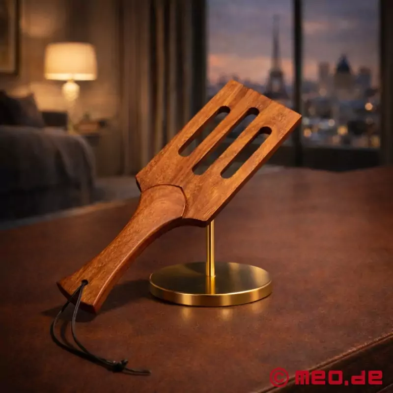 BDSM paddle ir izgatavots no masīvkoka un pārsteidz ar savu augsto kvalitāti. Iedobumi airiņa trieciena virsmā samazina gaisa pretestību spankinga laikā un nodrošina augstu trieciena intensitāti.