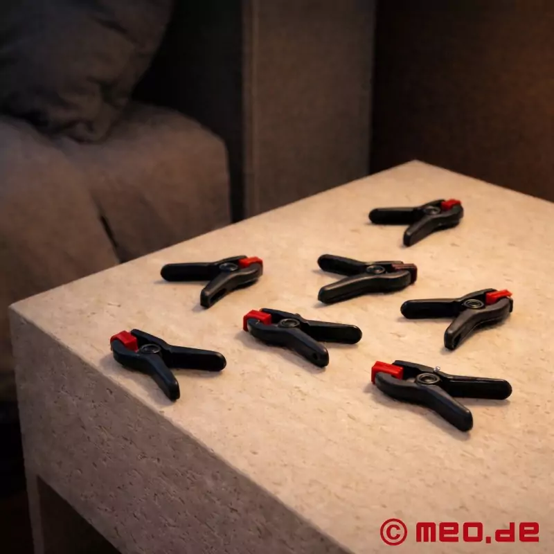 Šīs BDSM skavas ir tiešas un bezkompromisa - tās nav paredzētas vājprātīgajiem. Tie ir paredzēti ikvienam, kas vēlas apzināti izjust spēcīgu stimulāciju, pastāvīgu spiedienu un intensīvu stimulācijas veidu. Pateicoties spēcīgajai atsperei un plašai kontakta virsmai, tie rada spēcīgu saspiešanas spēku un drošu fiksāciju.