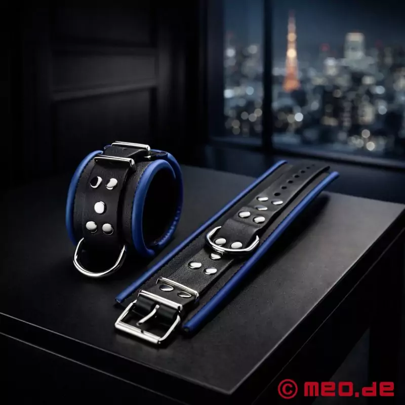 Die blau/schwarzen Fußfesseln von MEO sind sehr stabil, lassen sich gut schnüren und halten dann auch sehr gut kräftiger Gegenwehr stand.