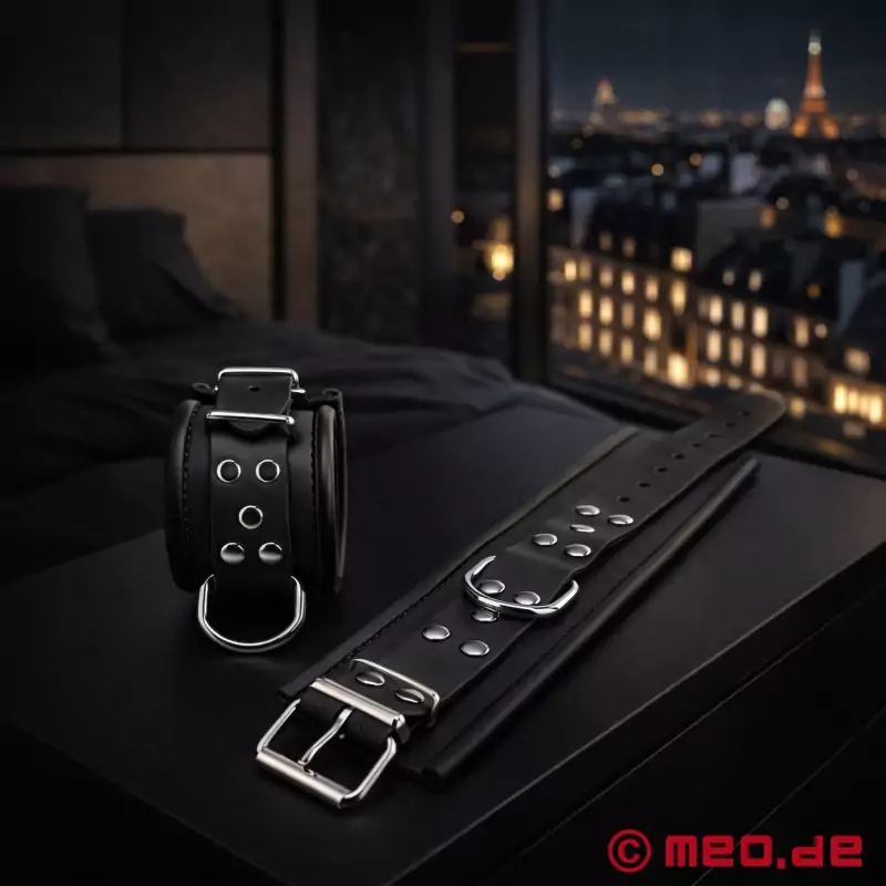 Papildus šīm izsmalcinātajām kāju dzelžiem MEO® Paris kolekcijā ir arī roku dzelži, kas kopā veido pilnīgu komplektu izsmalcinātas verdzības cienītājiem.