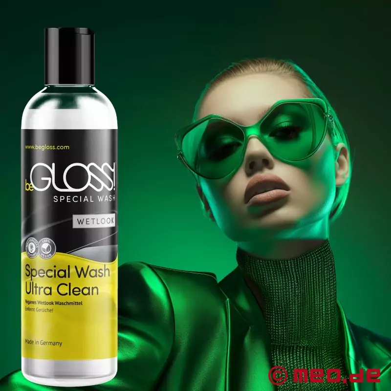 Seksīgam mitra izskata apģērbam nepieciešama īpaša tīrīšana. beGLOSS® Special Wash™ ir īpašs tīrīšanas līdzeklis, kas ir ideāli piemērots šim nolūkam. Tas maigi, ātri un efektīvi noņem netīrumus un nepatīkamas smakas, kā arī palīdz kopt mitrā stila apģērbu un aksesuārus. Tas arī palīdz saglabāt materiāla elastību un pasargā to no plaisāšanas. Ražots Vācijā.