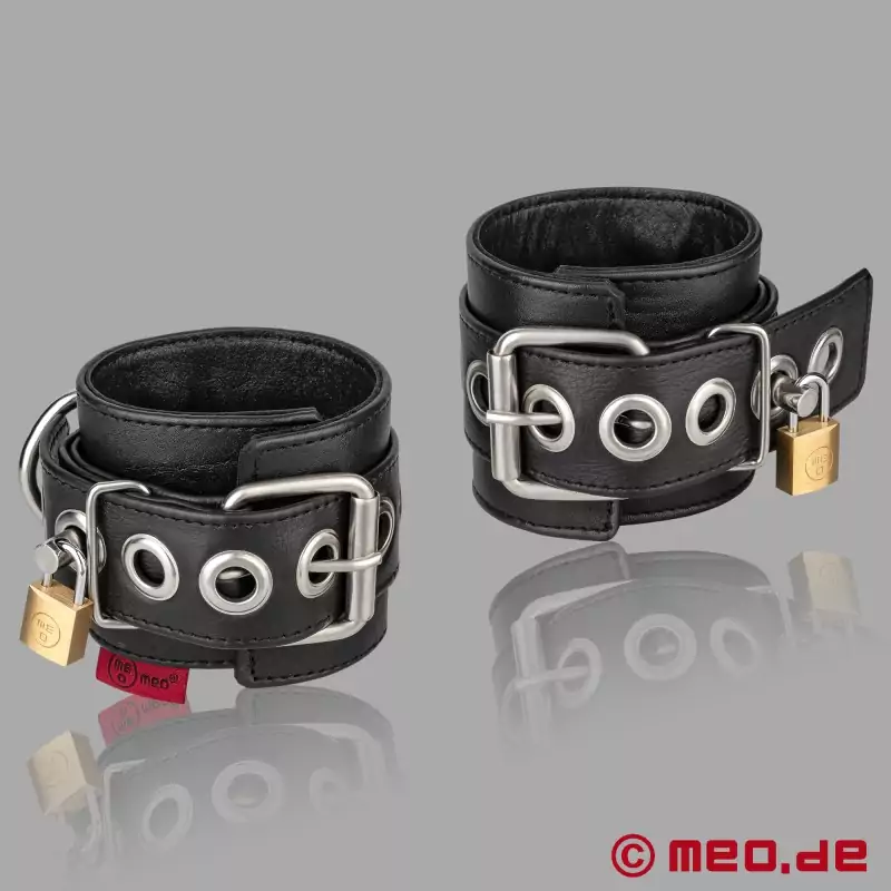 Mit diesen speziellen Bondage Handfesseln ist eine lange und wunderbare Bondage Session garantiert. Sie sind sehr robust und strapazierfähig. Dazu kommt noch das Design, um sie abzuschließen, sodass es kein Befreien gib. Da die Fesseln einen gestanzten Obergurt besitzen, habt ihr eine breite Auswahl für die perfekte Passgröße. Somit lassen sie sich an schmalen, als auch breiten Handgelenken gut und bequem Einstellen. Die Größe der abschließbaren Fessel beträgt 25 cm Länge x 7,5 cm Breite. Wie erwähnt wirken sie damit sehr groß und grob, jedoch ändert sich das, sobald ihr sie anlegt. Ihr könnt sie natürlich auch für die Fuß- statt Handgelenke nutzen. Ein hübsches Detail fällt auf, sobald ihr euch die Nieten und die kleinen Alltagsvorhängeschlösser genauer anschaut. Alle davon besitzen nämlich das MEO Logo. Nun könnt ihr also euren Partner fixieren und dabei sieht er dann noch richtig gut aus. Durch die D-Ringe habt ihr auch noch die Möglichkeit weitere Fesselungsutensilien wie Seile oder Ähnliches zu befestigen. Das macht eure Bondage Session dann wirklich komplett.