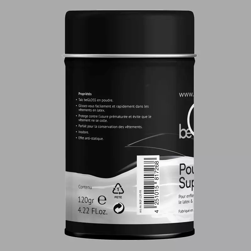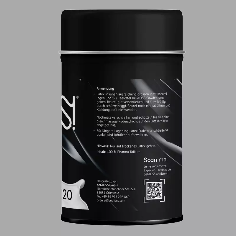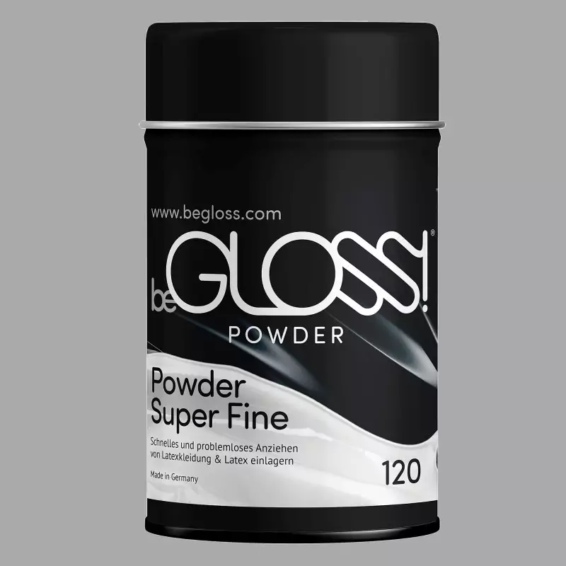 BeGLOSS® talka pulveris ir īpašs palīglīdzeklis latex apģērbiem un maskām. Tas atvieglo apģērba uzvilkšanu un padara latexu patīkami elastīgu. Tas uzreiz savienojas ar materiāla struktūru, novērš tā salipšanu un ir ideāli piemērots lateksa apģērba ilgstošai uzglabāšanai. Ražots Vācijā.
