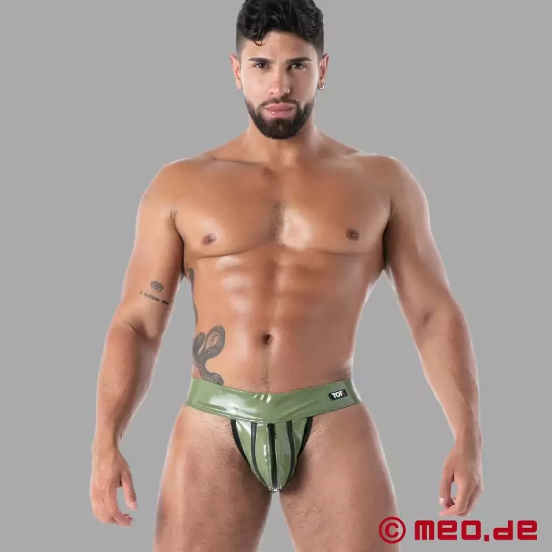Šis haki krāsas lateksa suspensors ir ideāli piemērots ikvienam, kam patīk īpaši atklāts apģērbs. Tam ir ideāls anatomisks piegriezums priekšpusē un bezkompromisa atvērts aizmugurē, kas garantē maksimāli seksīgu efektu. Līdzīgi kā klasiskajos suspensoros, tas atsedz sēžamvietu, bet rāvējslēdzējs priekšpusē izceļ seksīgo izskatu. Haki krāsā latekss izskatās īpaši "pilsētniecisks", bet melnās kontrastējošās līnijas piešķir sportisku akcentu. Izstrādāts un ražots Parīzē, Francijā.