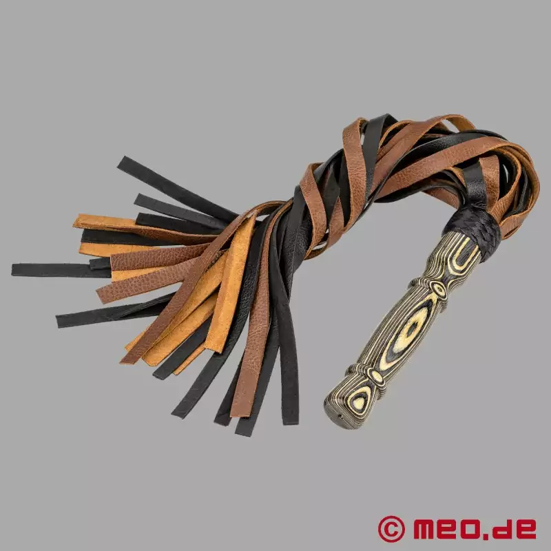 No mīksta uz cietu: cēls pātagotājs ar nubuka ādas siksnām un smalki pulēta zebras koka rokturi. Flogger siksnas rada pārsteidzoši asas sāpes, pateicoties to augstajai izturībai, un var atstāt skaidras pēdas!