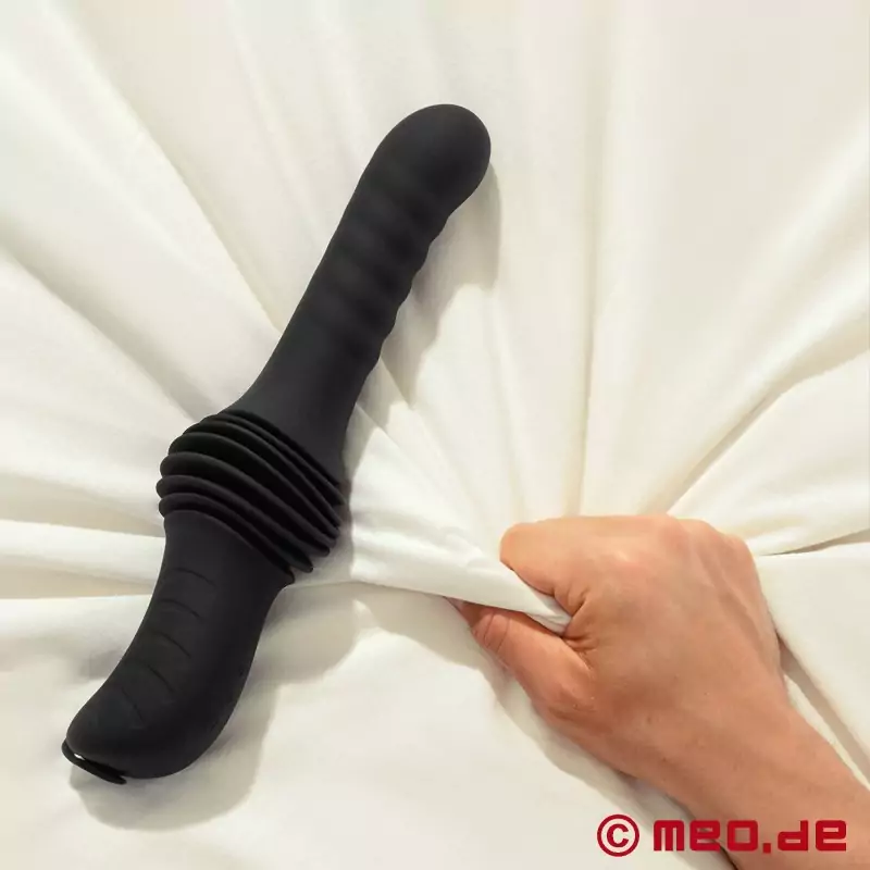 Jūs varat turēt MEO® DeepThrust™ rokā kā klasisku Stumjošs vibrators un mērķtiecīgi vadīt to vai arī nostiprināt to vietā, izmantojot piesūcekņa stiprinājumu, un ļaut tam veikt savu uzdevumu intensīvai, brīvroku iespiešanai. Mīkstais, zīdaini matētais silikona kāts ar iebīdāmo garumu aptuveni 17 cm ērti slīd anālajā atverē vai makstī, savukārt vibrators spēcīgi spiež uz priekšu un atpakaļ līdz aptuveni 7 cm. Piecas vilkšanas programmas un desmit vibrācijas režīmi nodrošina, ka jūs saņemat visu, ko vēlaties, sākot no lēni pieaugošas iespiešanās līdz maksimāli intensīviem, spēcīgiem vilkšanas spēkiem.