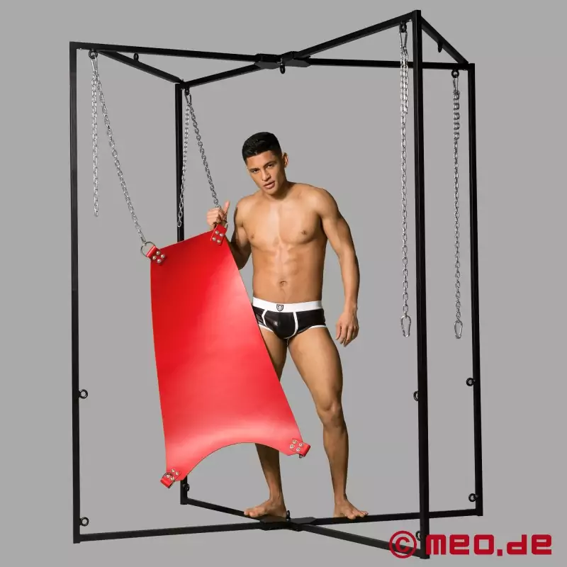 Ja nevēlaties piestiprināt mūsu slingu pie guļamistabas griestiem, mēs iesakām mūsu praktisko slinga rāmi. Jūs varat izmantot mūsu mīksto ādas spilvenu, lai palielinātu savu komfortu gulēšanas laikā, savukārt ādas vai gumijas kāju cilpas ļauj jums turēt kājas izstieptas atvieglotā stāvoklī. Jums labi kalpos arī spogulis, ko varat piestiprināt pie slinga augšdaļas, jo tas ļaus visu novērot līdz sīkākajai detaļai. Papildus fistingam paredzētajam krēmam, piemēram, LETS'S FUCK, un lateksa cimdiem lieliski noderēs arī mūsu īpašie roku dzelži. MEO ® atradīsiet arī daudzus citus piederumus, piemēram, ķēdes, drāšanas mašīnas statīvu, cimdu vai Crisco turētāju un daudz ko citu. Mums patīk arī tā sauktie "fetiša spilventiņi". Šie spilventiņi ir mitrumu ļoti labi uzsūcošas apakšsegas, kas ir ļoti populāras BDSM kopienā, jo garantē neierobežotu baudu seksa laikā slingā, jo tās droši uzsūc visus izdalījušos šķidrumus. Starp citu, vai zinājāt, ka mūsu slinga rāmi varat kombinēt arī ar mūsu Doggy Style seksa soliņu vai slinga dēli?